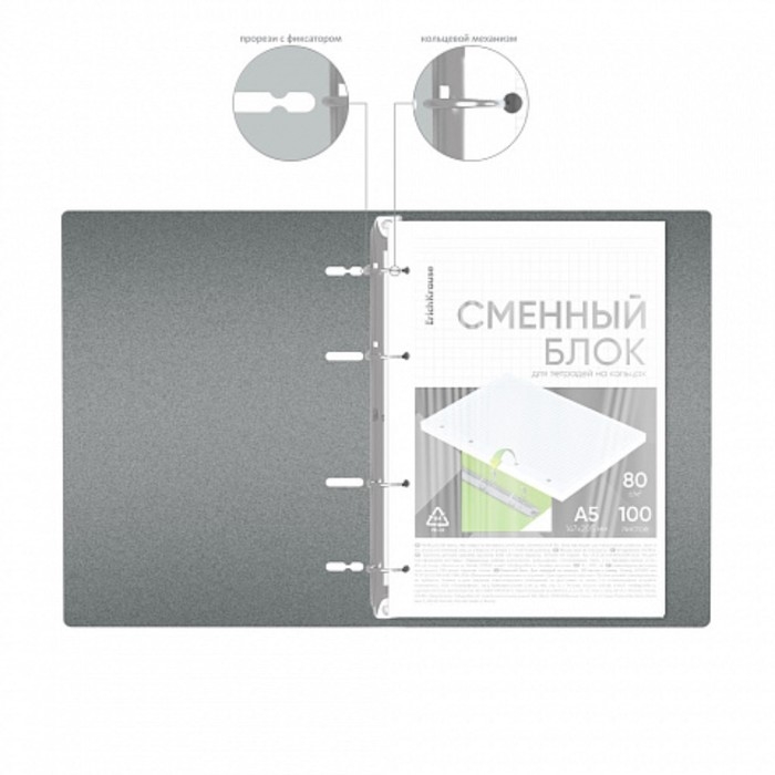Тетрадь общая формата А5 (147x205 мм). Обложка из высококачественного износостойкого матового пластика с фактурой «песок». В блоке 100 листов в клетку в рамке. Бумага офсетная плотностью 80 г/м2. Цвет линовки — синий. Скругленные уголки обложки. Тип скрепления — кольца. Прорези под кольца оснащены фиксаторами, которые предотвращают раскрытие тетради.