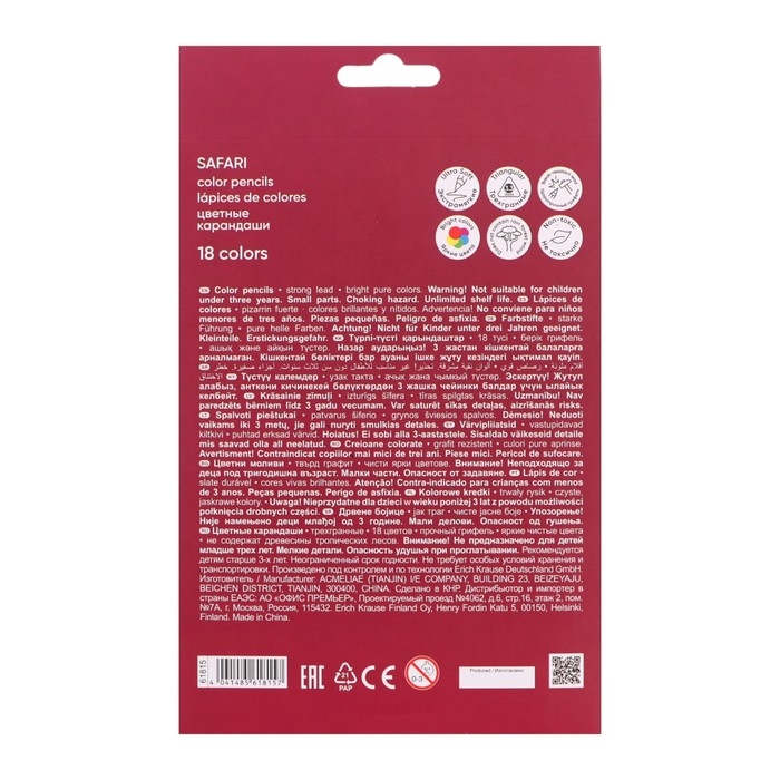 Карандаши 18 цветов ErichKrause Safari, дерево, трехгранные, с европодвесом