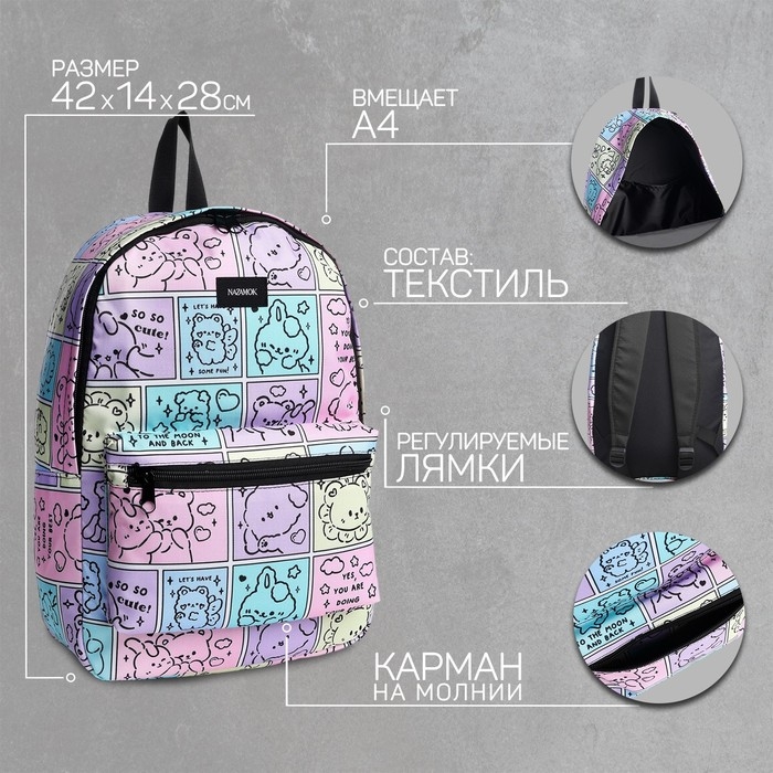 Рюкзак школьный текстильный «Зверята», 42х14х28 см