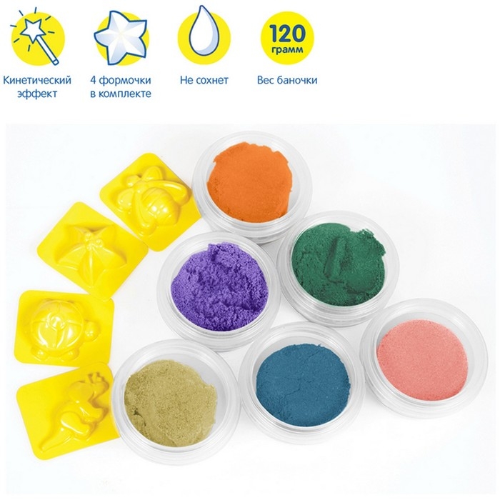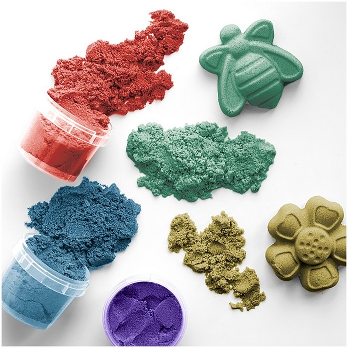 - Лепка из песка — это увлекательное занятие, которое развивает фантазию, творческое мышление и креативность, а яркие насыщенные цвета развивают цветовое восприятие у детей.