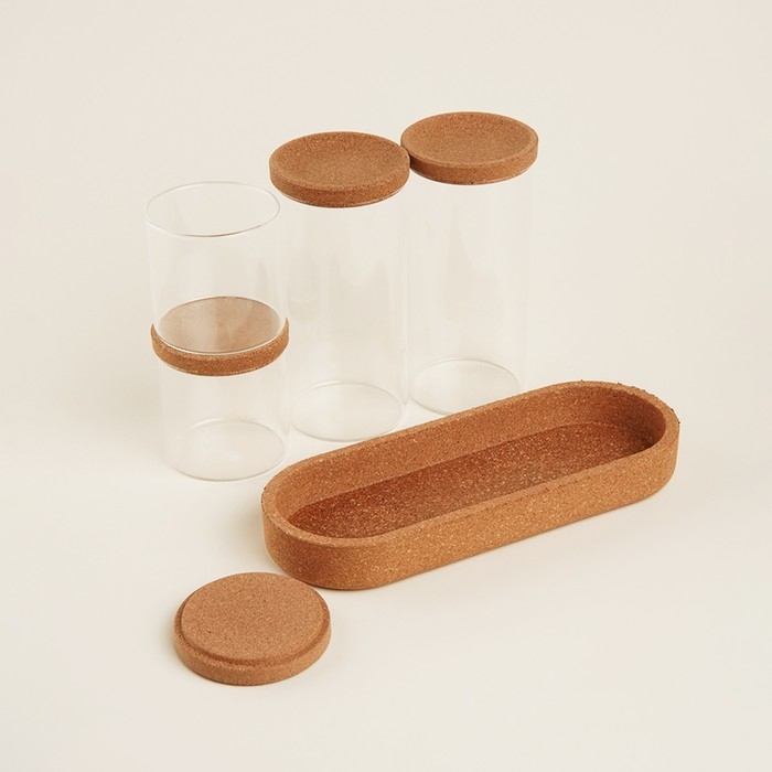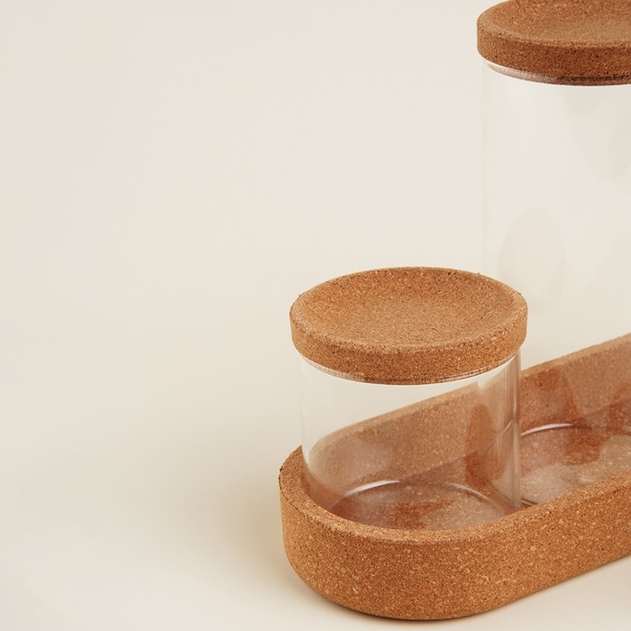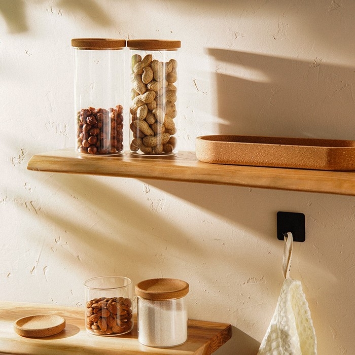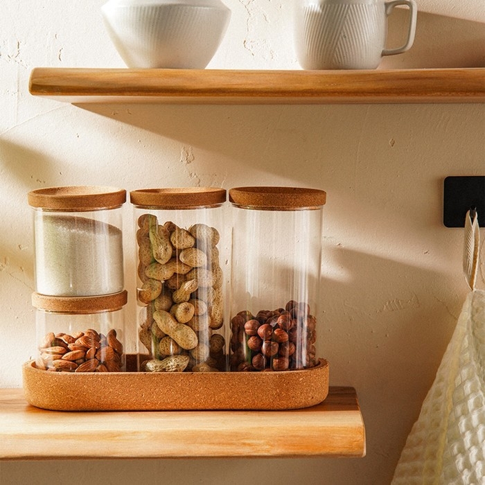 Банки оснащены пробковыми крышками, которые закрываются без герметичности, обеспечивая защиту продуктов от внешних факторов, таких как пыль и влажность. Гладкая текстура стекла и круглые формы придают изделиям современный и универсальный вид, вписывающийся в любой интерьер кухни.