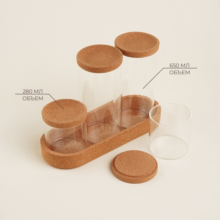 Набор банок стеклянный для хранения сыпучих продуктов SL Home «Алькорноке», 5 предметов: 4 банки 280/650 мл, с пробковой крышкой, на подставке