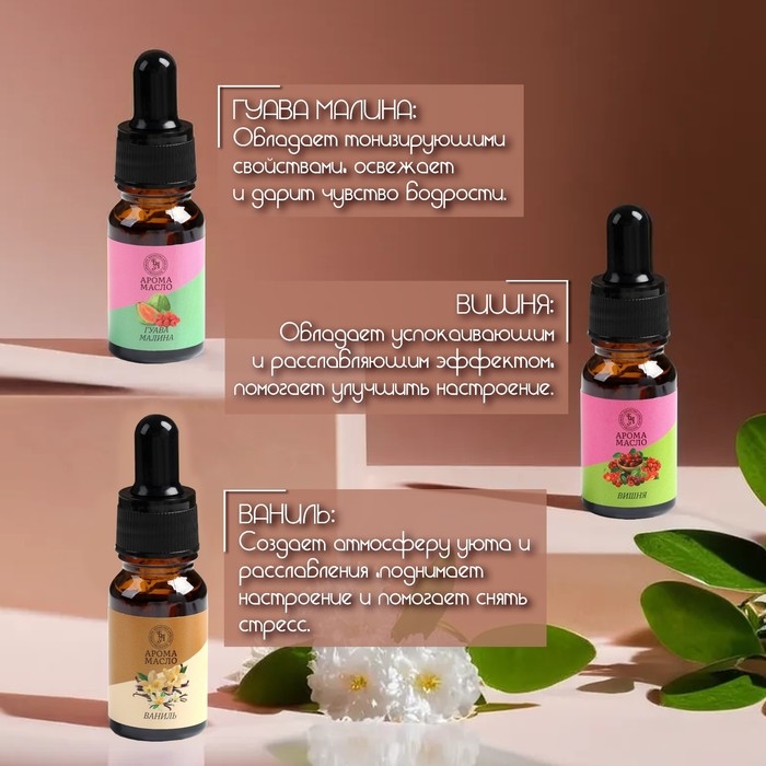Бергамот, Ваниль, Вишня, Гуава, Жасмин, Кокос, Кофе, Лаванда, Малина, Ментол, Цитрус