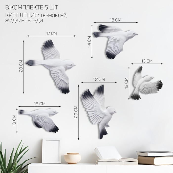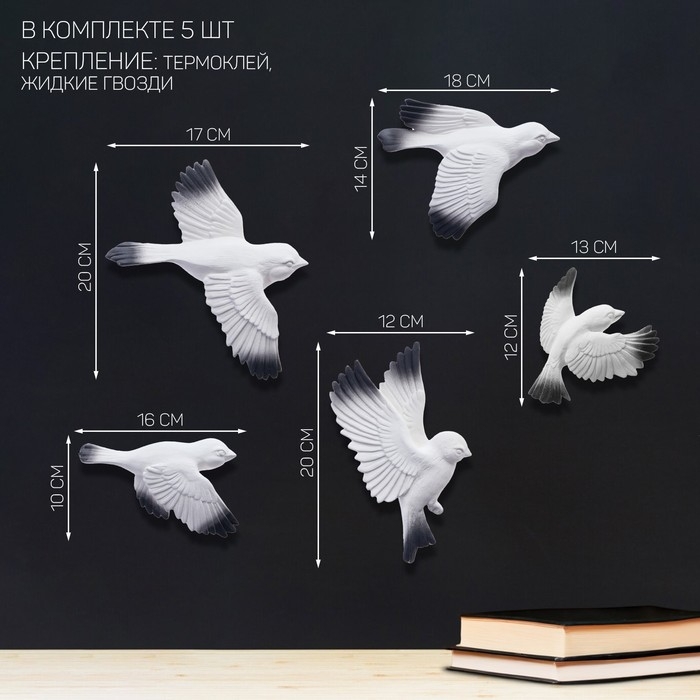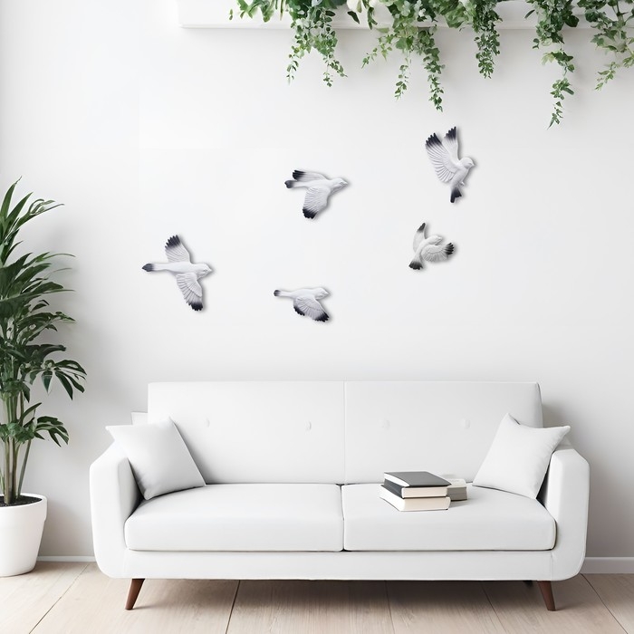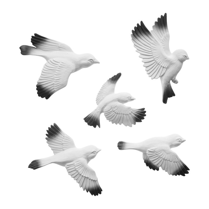 Декорация настенная, гипсовое панно "Птицы" 5 шт, белые с черными крыльями