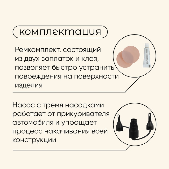 - Насос с тремя насадками работает от прикуривателя автомобиля и упрощает процесс накачивания всей конструкции.