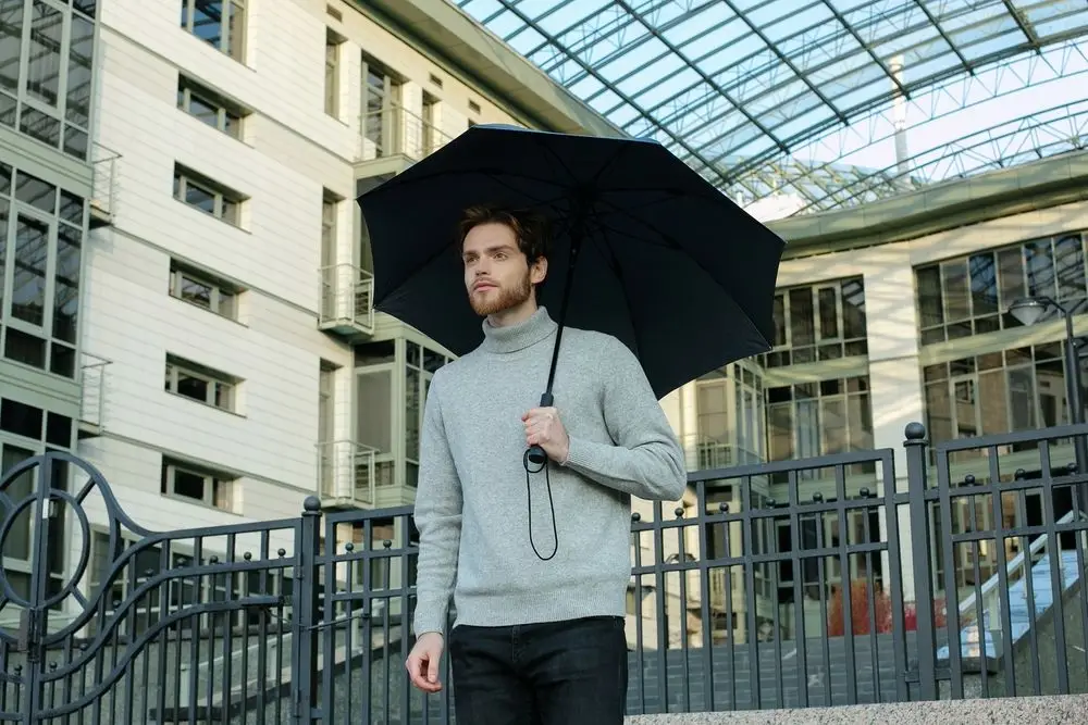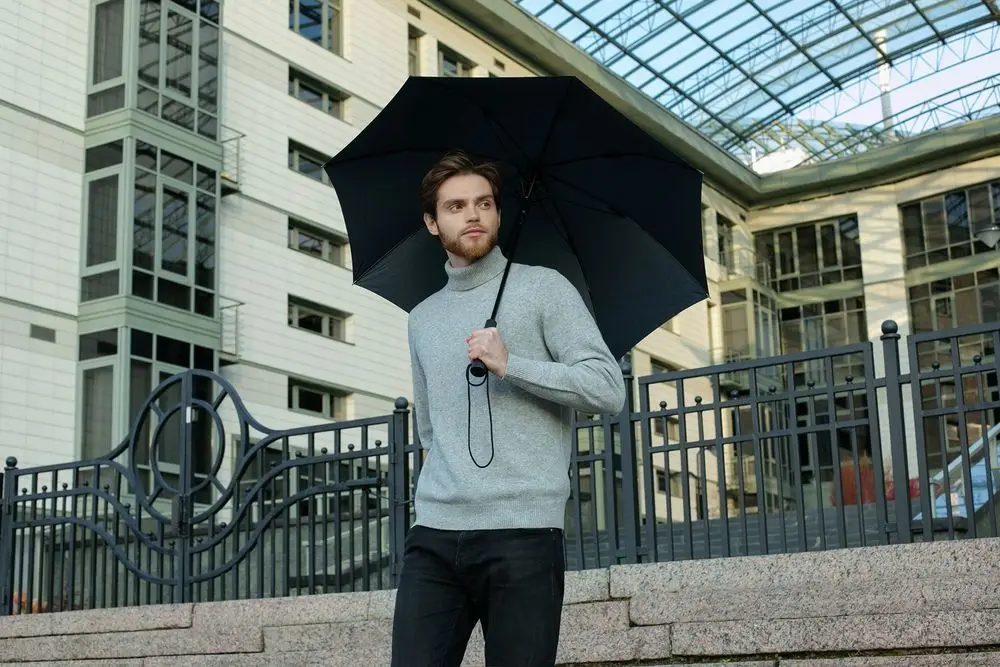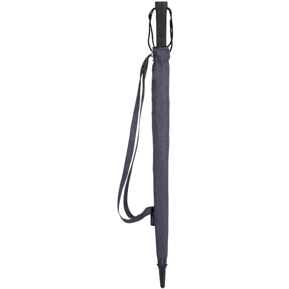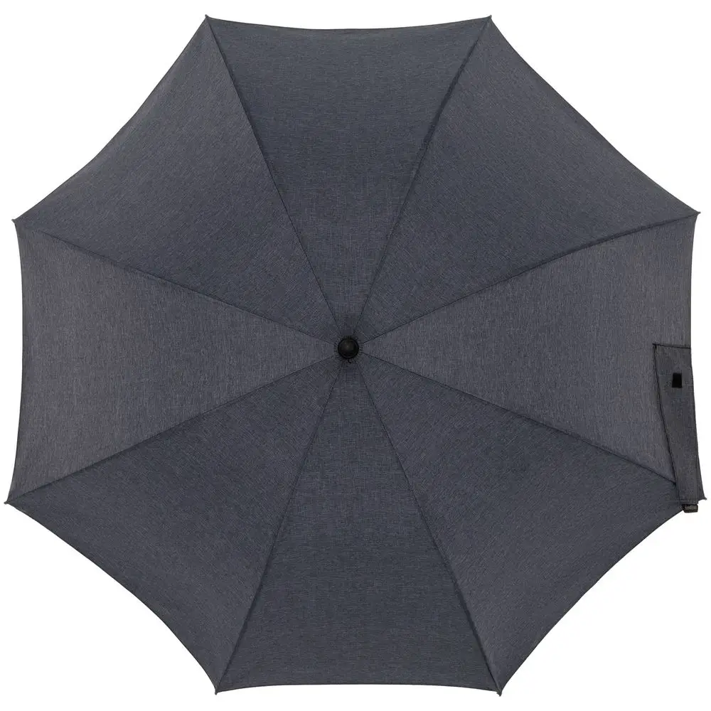 Зонт с куполом из меланжевой ткани уже достаточно необычен, но все еще вписывается в строгий дресс-код. Широкий хлястик трапециевидной формы предлагает достаточно места для нанесения логотипа.