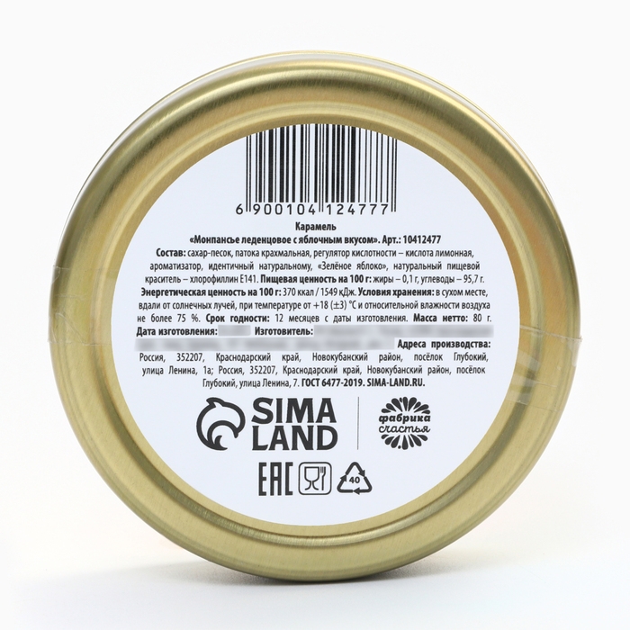 Состав: сахар-песок, патока крахмальная, регулятор кислотности – кислота лимонная, ароматизатор, идентичный натуральному, «Зелёное яблоко», натуральный пищевой краситель – хлорофиллин Е141.