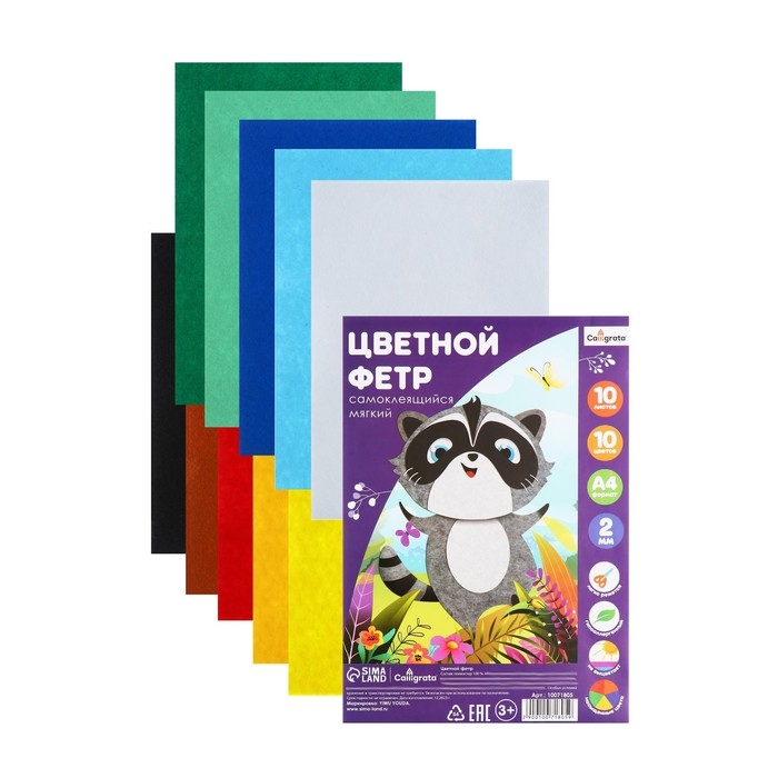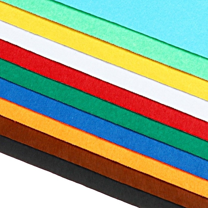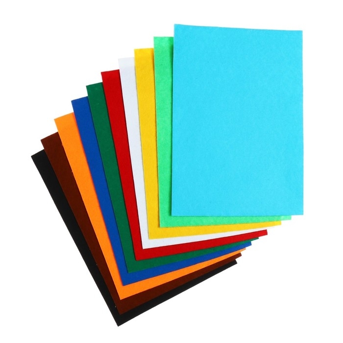 Фетр цветной набор, толщина-2 мм, формат А4, мягкий, 10 листов, 10 цветов, самоклеящийся