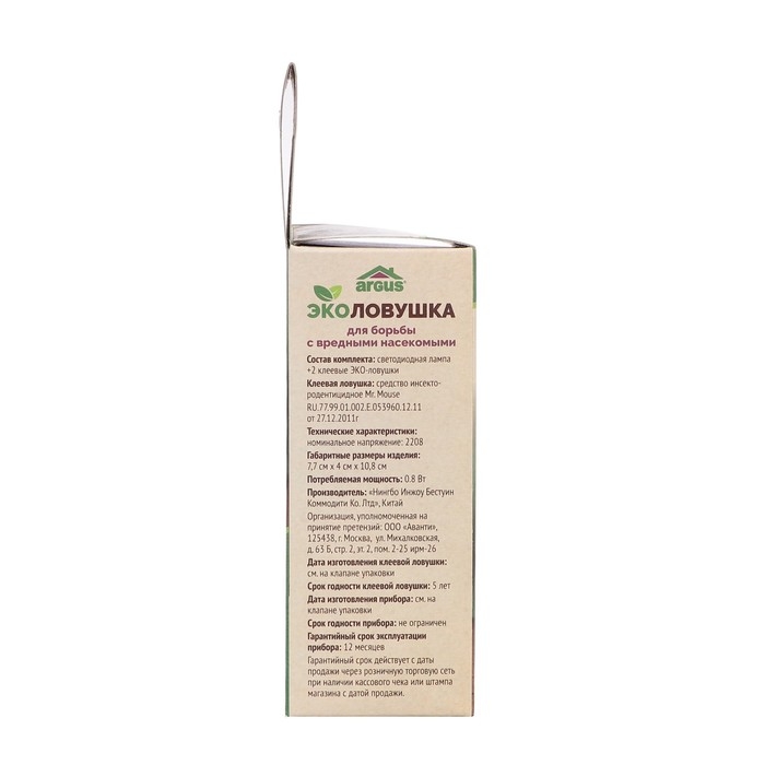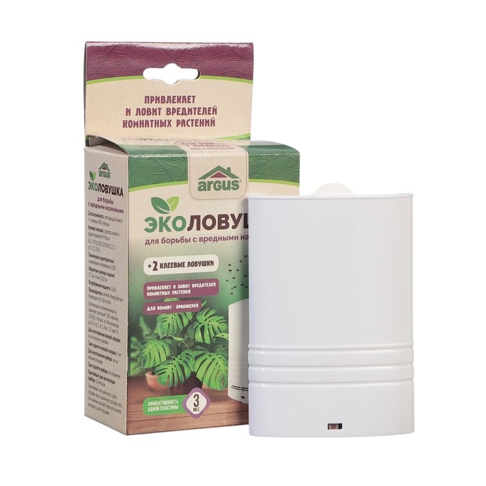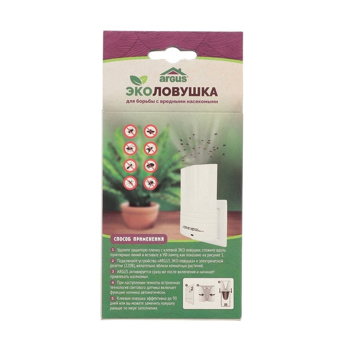 ARGUS ЭКО ловушка для комнат и оранжерей! Защита растений от плодовой (дрозофила) и цветочной мошки, тли, белокрылки, грибных комариков и защита помещений от моли, мух и комаров до 3 месяцев! Принцип действия ловушки от вредных насекомых очень прост! При включении прибора в розетку 220В и наступлении темного времени суток, автоматически срабатывает датчик ультра-фиолетового света. УФ свет наиболее привлекателен для большинства вредных насекомых. Подлетев к лампе, насекомые прилипают к специальной ловушке с клеевой основой , расположенной внутри прибора. Клеевая пластина изготовлена на основе каучуковых смол , без содержания ядов и химикатов. В отличии от инсектицидных средств борьбы с летающими насекомыми, ловушка может работать всю ночь и это абсолютно безопасно для Вашего здоровья. Две сменные клеевые пластины, которые находятся внутри прибора и входят в комплект, рассчитаны на 3 месяца защиты каждая, меняется по мере необходимости.