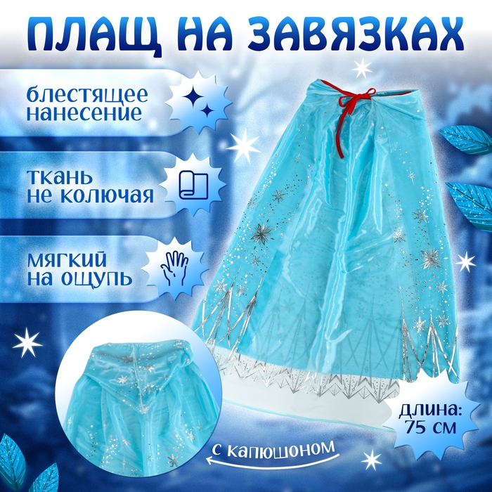 - Мягкий и приятный на ощупь плащ выполнен из ткани с блестящим покрытием. Длина изделия составляет 75 см, что делает его удобным для детей. Плащ завязывается на завязки, а капюшон добавляет образу загадочности.