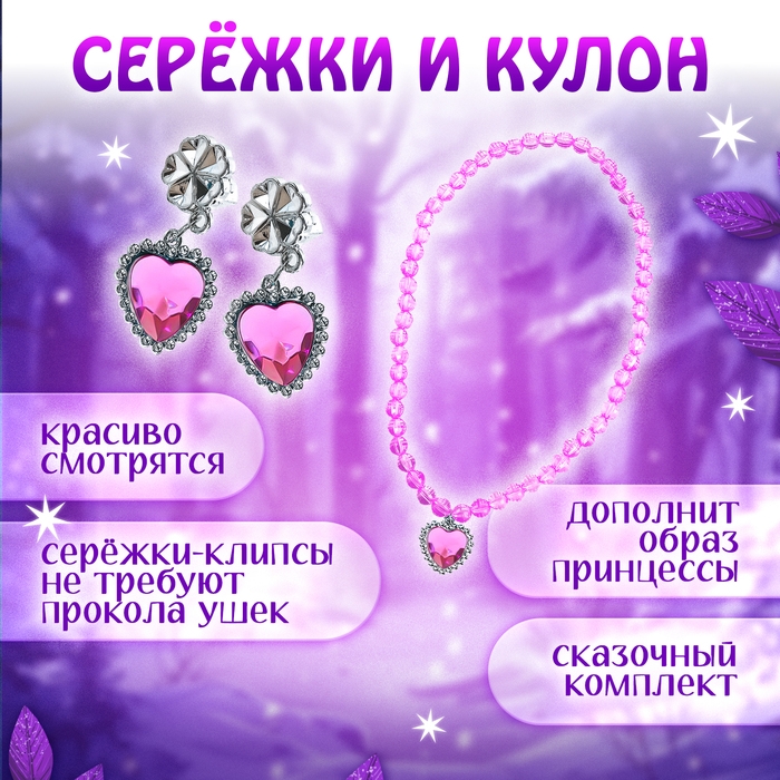 - Сказочные украшения с камнями завершают образ. Серьги-клипсы легко надеваются и не требуют прокола ушей, что удобно и безопасно для ребёнка.