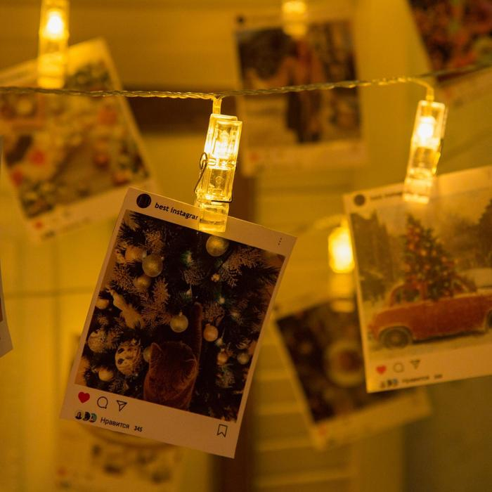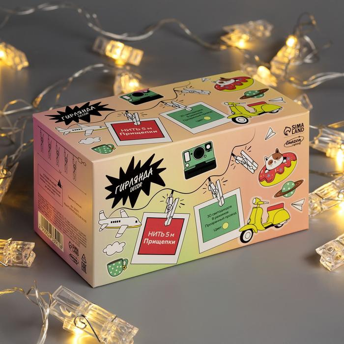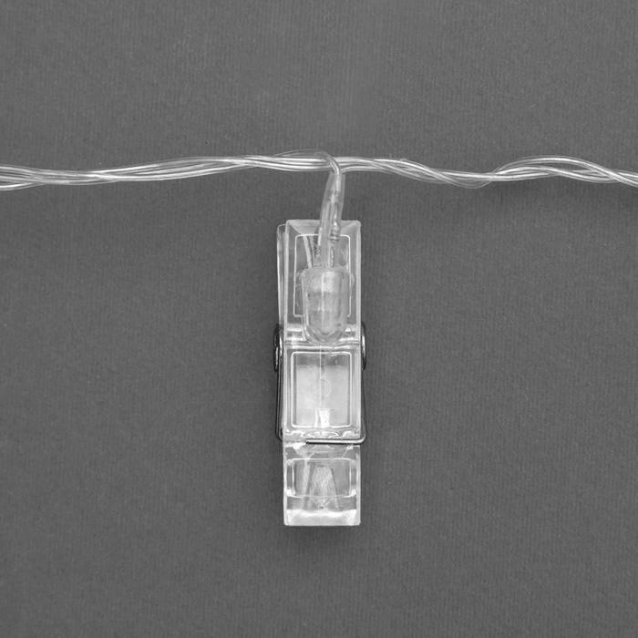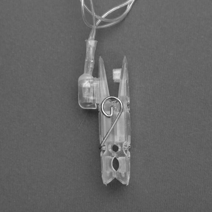Гирлянда «Нить» 5 м с насадками «Прищепки», IP20, прозрачная нить, 30 LED, свечение тёплое белое, 8 режимов, 220 В