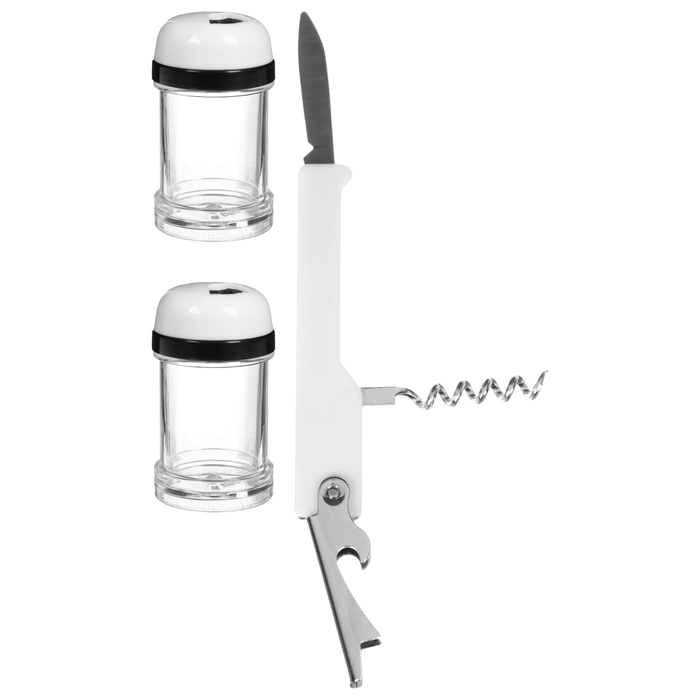 - Универсальный набор многоразовой посуды: ножи, вилки, ложки, тарелки, стаканы, солонки и штопор.