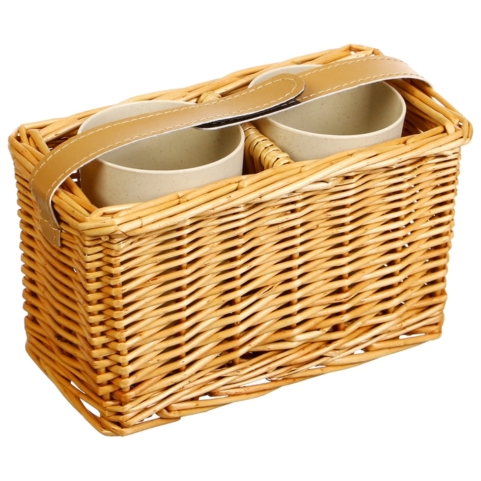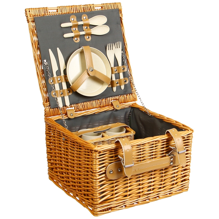 Корзина для пикника с посудой — компактный и функциональный набор для отдыха на природе. Изделие плотно фиксируется специальными ремешками. Корзина выполнена из натуральной лозы и имеет древесную текстуру.
