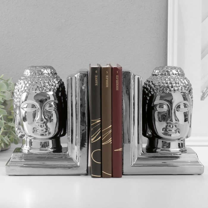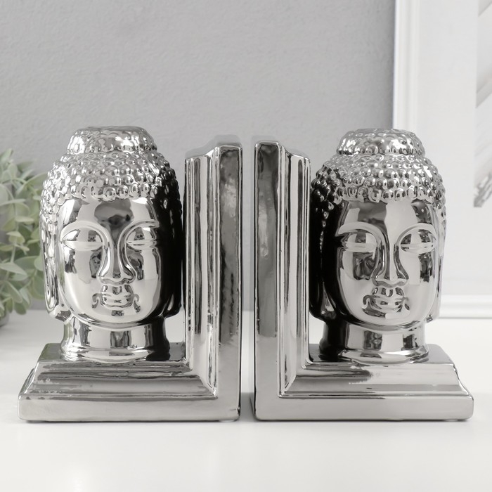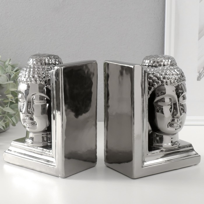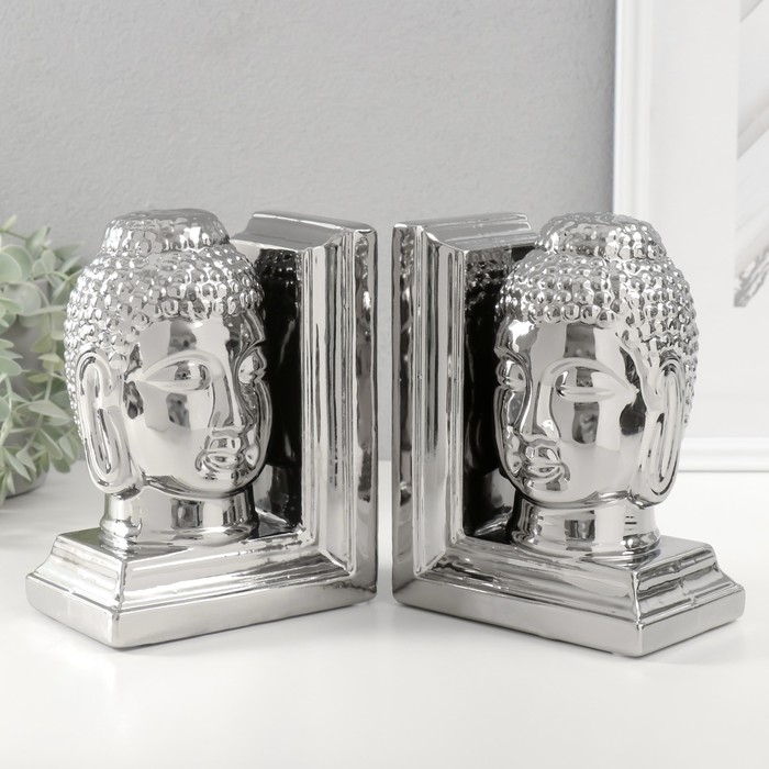 Держатели для книг керамика "Голова Будды" набор 2 шт серебро 14,5х10х18,5 см