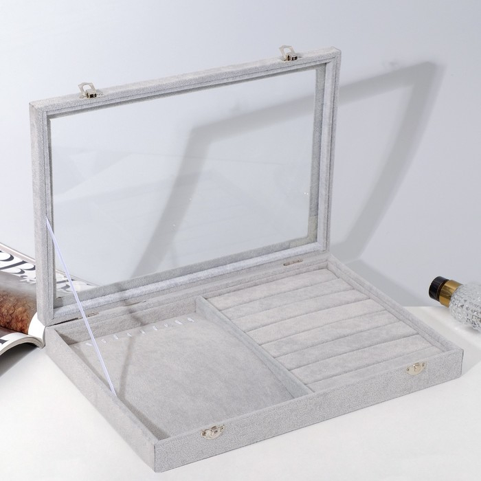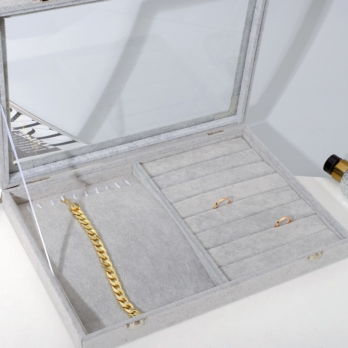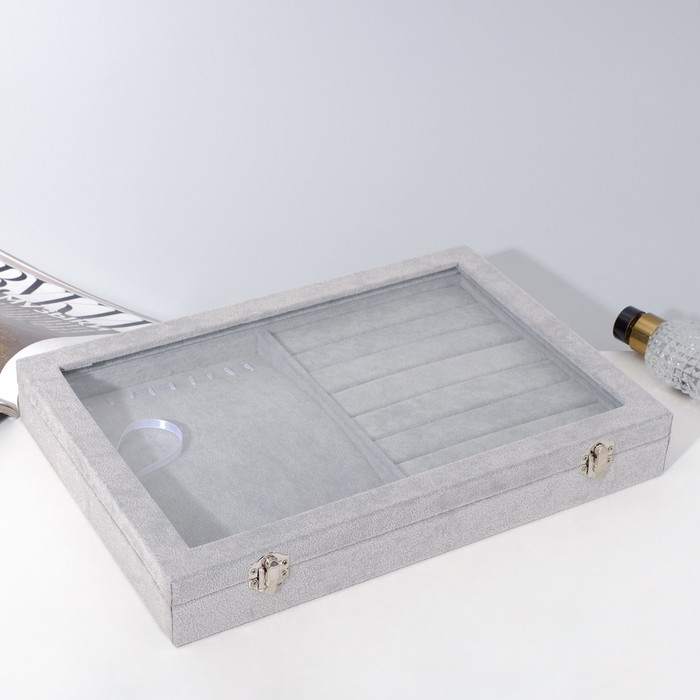 Подставка для украшений «Шкатулка» 10 крючков и 7 полос, 35×24×5, стеклянная крышка, цвет серый
