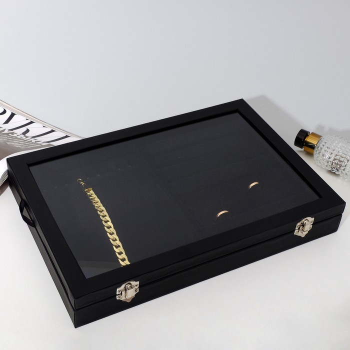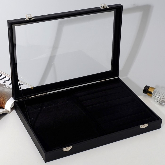 Подставка для украшений «Шкатулка» 10 крючков и 7 полос , 35×24×5, стеклянная крышка, цвет чёрный