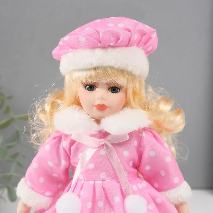Кукла коллекционная керамика "Малышка Лиза в розовом платье в горох, с мехом" 21 см