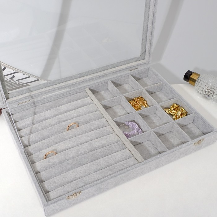Подставка для украшений «Шкатулка» 9 полос, 12 ячеек, 35×24×4,5, стеклянная крышка, цвет серый
