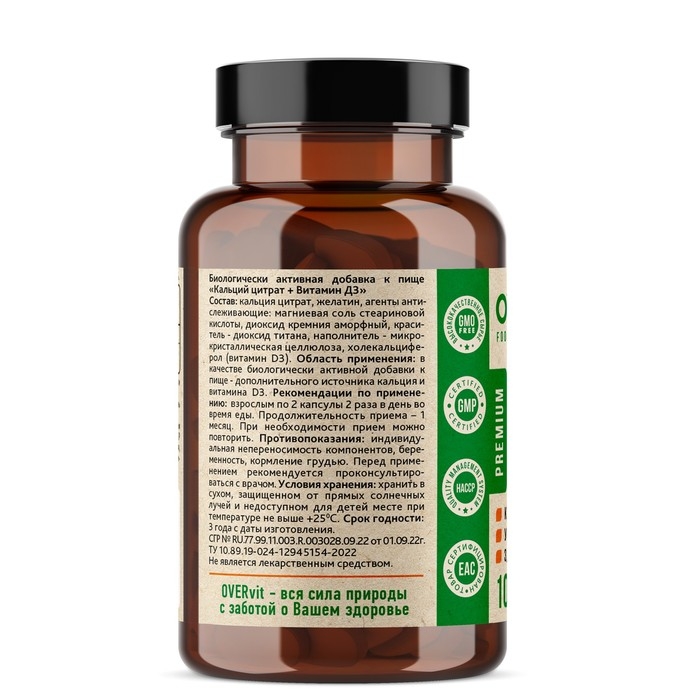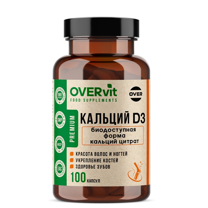 Кальций цитрат + Витамин Д3 OVERvit, 100 капсул