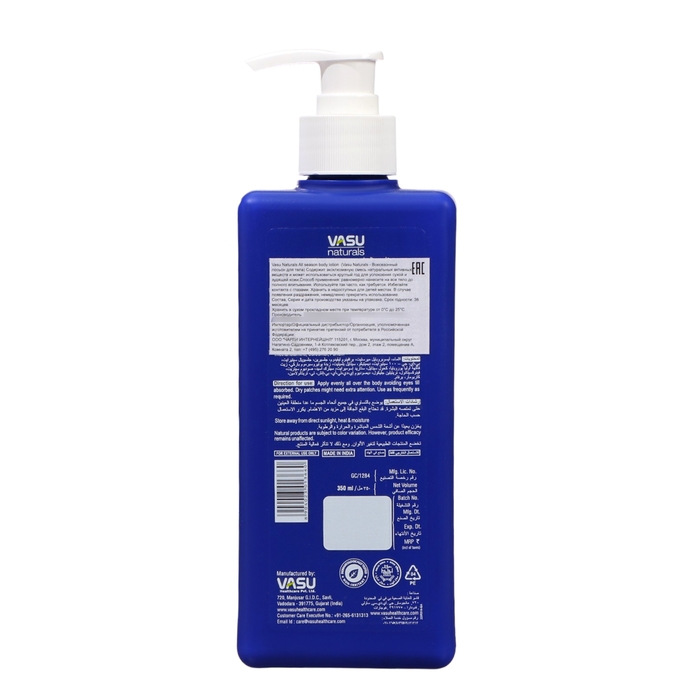 Лосьон для тела Vasu всесезонный представлен в упаковке объемом 350 мл, что обеспечивает длительное использование продукта. Он имеет приятный аромат и легко впитывается, не оставляя жирного блеска.