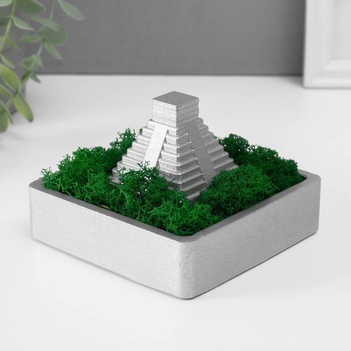 Кашпо бетонное "Храм Солнца" высота 8 см 11,5х11,5 см серебро со мхом (мох зелен. стабилиз)