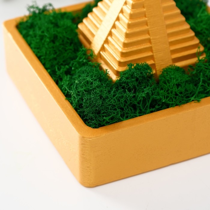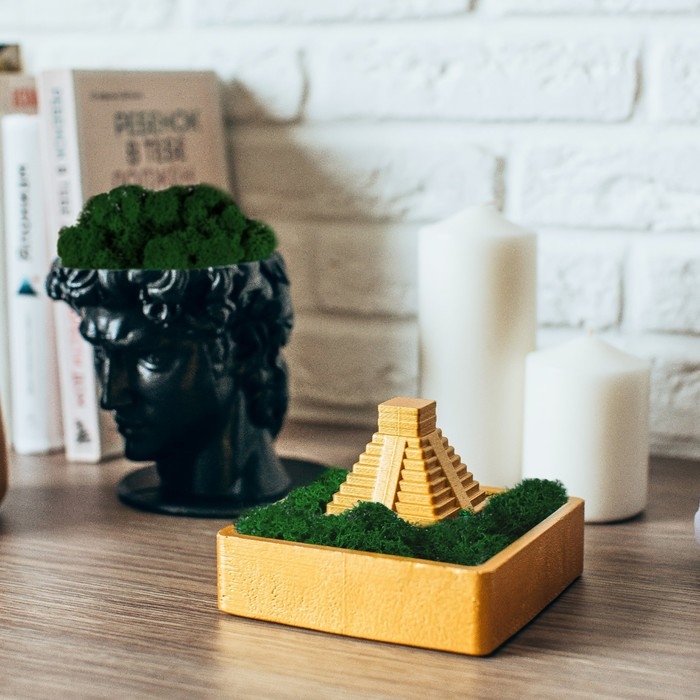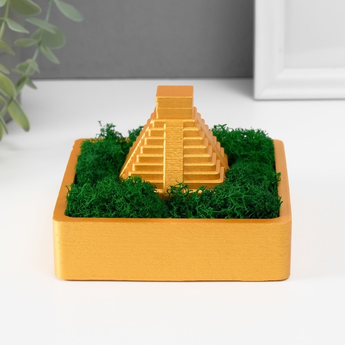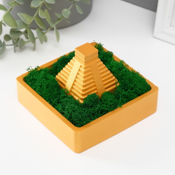 Кашпо бетонное "Храм Солнца" высота 8 см 11,5х11,5 см золотой со мхом (мох зелен. стабилиз)