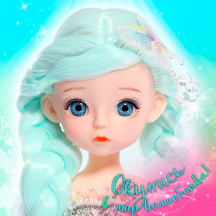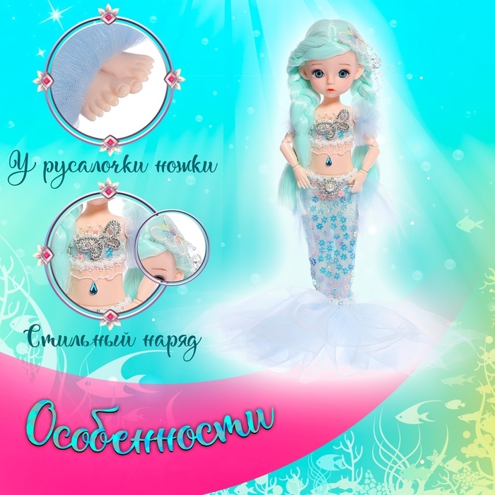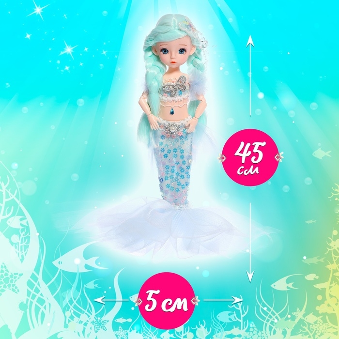 Кукла в образе русалки с голубыми оттенками станет отличным подарком для девочек. Высота игрушки составляет 45 см, что делает её удобной для игры и создания удивительных приключений.