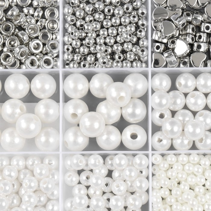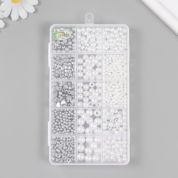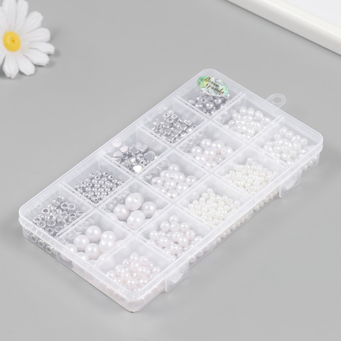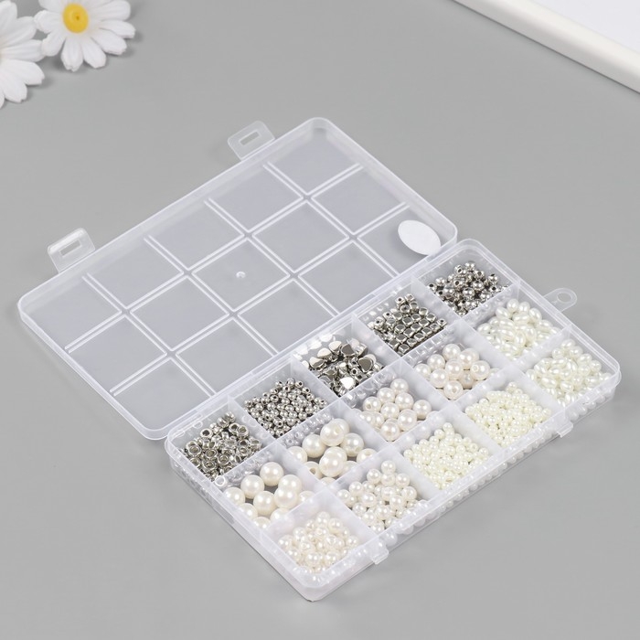 Бусины в шкатулке "Белый перламутр и серебро" 15 делений 10х17,5х2 ссм