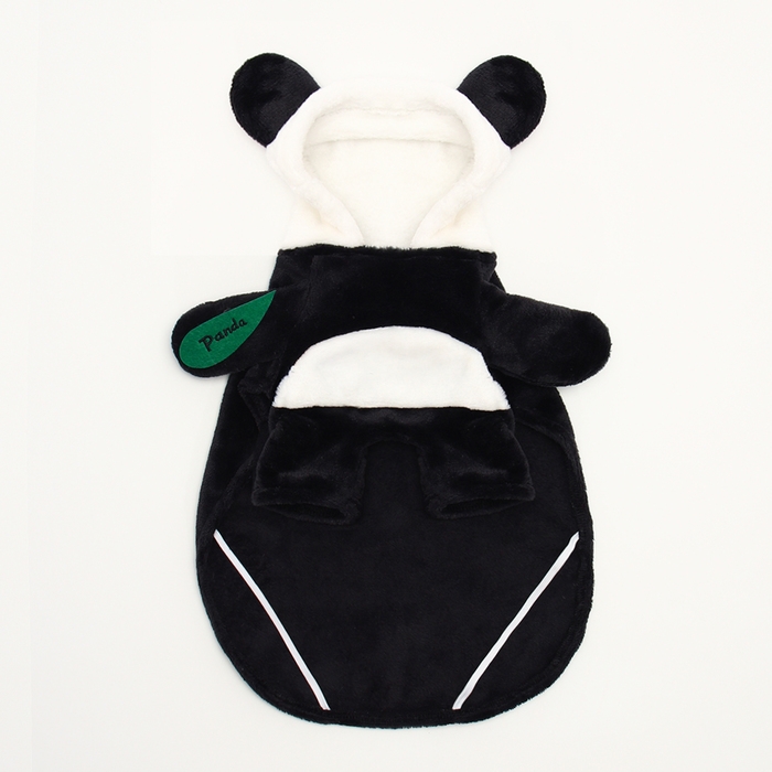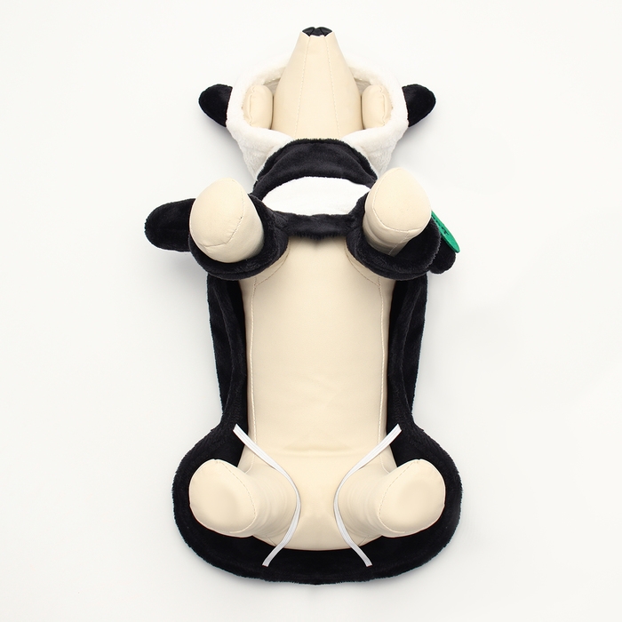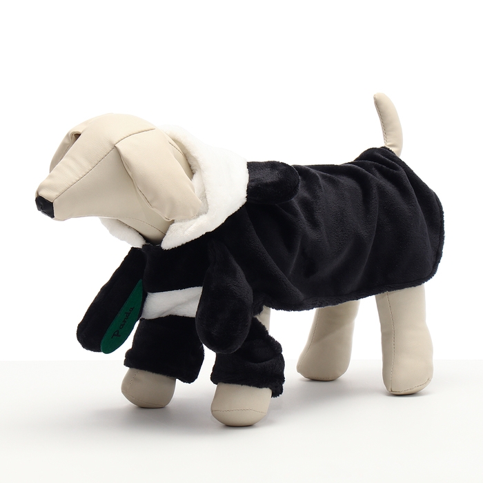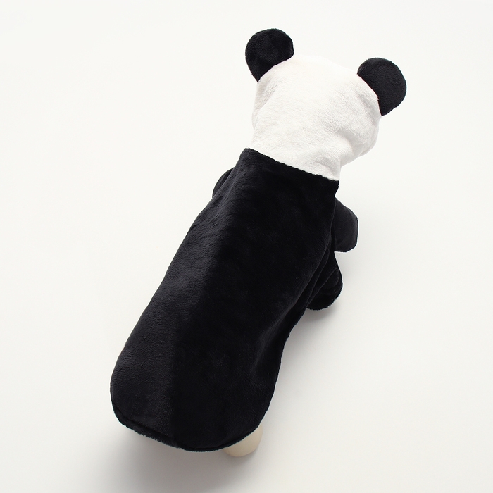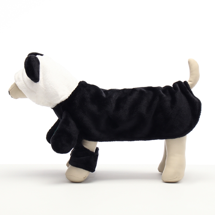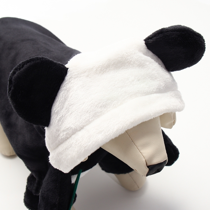 Костюм выполнен из качественного текстиля, что гарантирует его долговечность и удобство в носке. В нем отсутствуют застежки, что позволяет легко надевать и снимать костюм, не причиняя неудобств собаке. Дизайн костюма сочетает в себе черные и белые цвета, создавая забавный и милый образ панды.