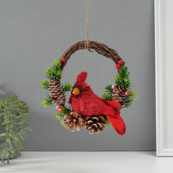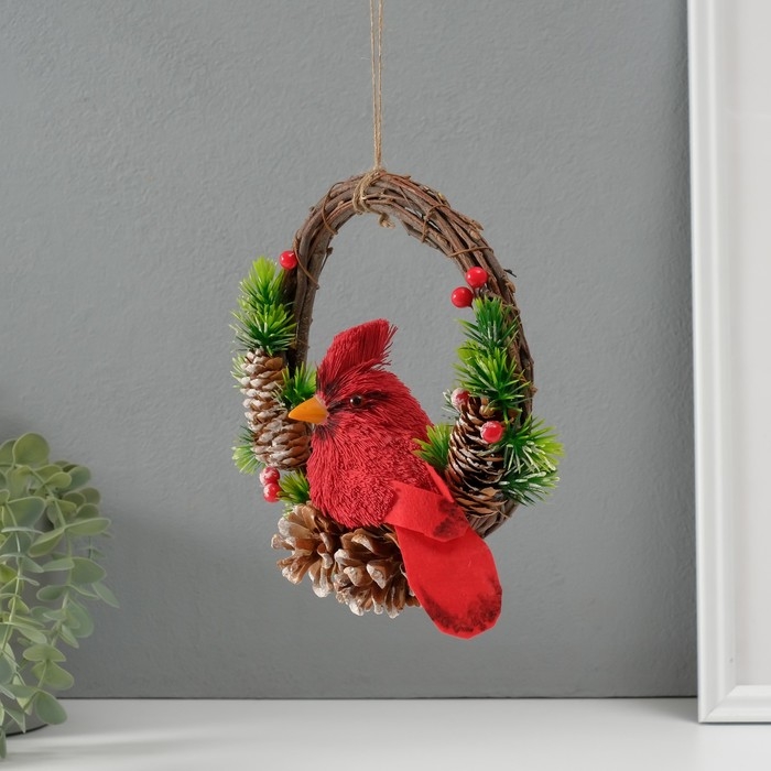 Сувенир подвеска "Красная птичка на венке с шишками" 7,5х20х20,5 см