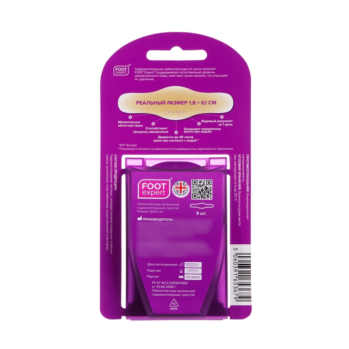 FOOT EXPERT – экспресс-решение при влажных мозолях. В состав пластыря входит гидроколлоидный полимер, состоящий из мельчайших частиц, которые образуют на поверхности тонкую пленку. При воздействии на пораженную кожу пленочка быстро впитывает отделяемую из раны жидкость, увлажняет поверхность кожи, хорошо пропускает воздух, не позволяет формироваться рубцам и корочкам при заживлении мозоли. Благодаря большому размеру пластырь содержит больше гидроколлоидной массы, чем другие пластыри, надёжнее защищая от трения. Оптимален для болезненных волдырей, например, вызванных спортивными занятиями.