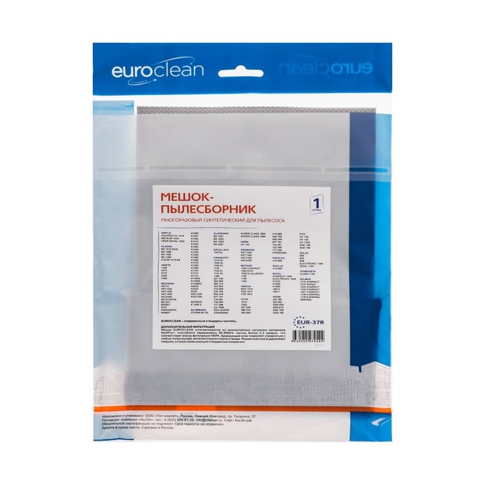 Мешок-пылесборник EUR-37R Euroclean — это многоразовое изделие, предназначенное для использования в пылесосах. Он изготовлен из прочного и долговечного материала, который обеспечивает эффективную фильтрацию воздуха от пыли и грязи.
