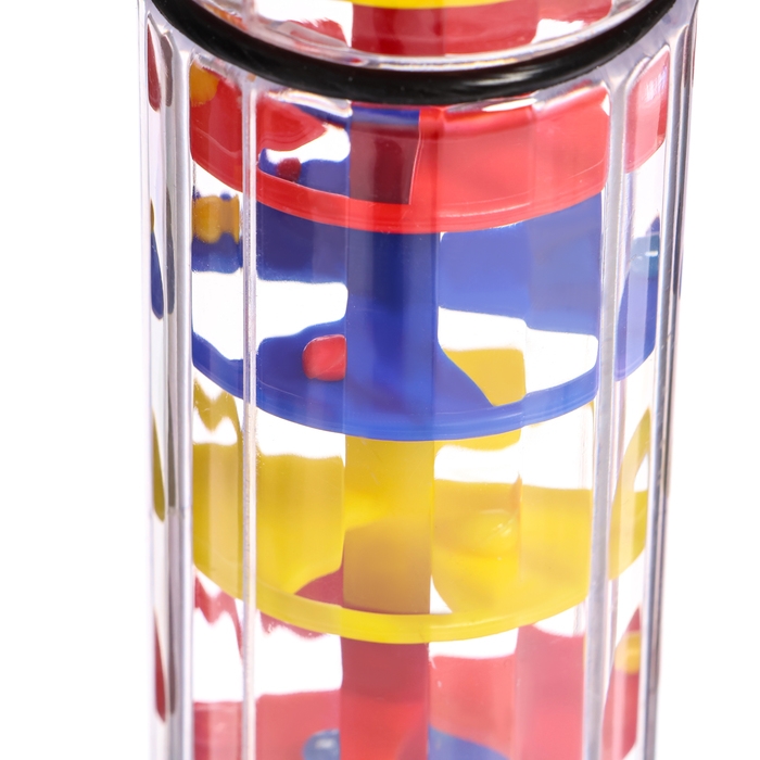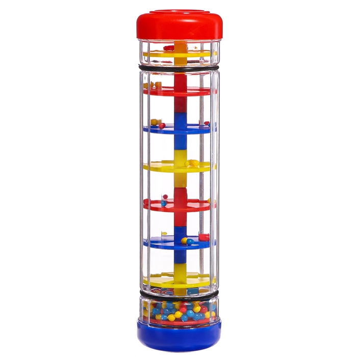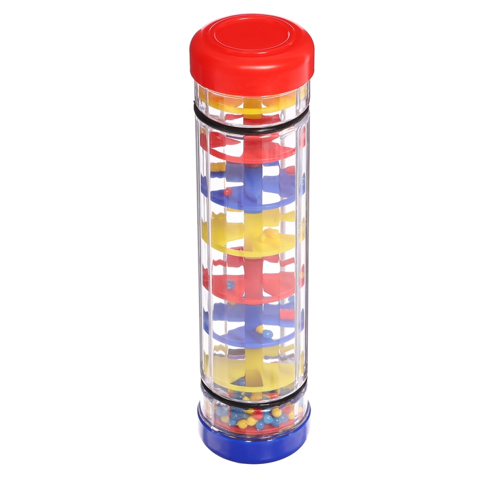 - Внутри прозрачного инструмента находятся разноцветные шарики, которые пересыпаются при движении и издают струящийся звук, слегка напоминающий шум дождя.