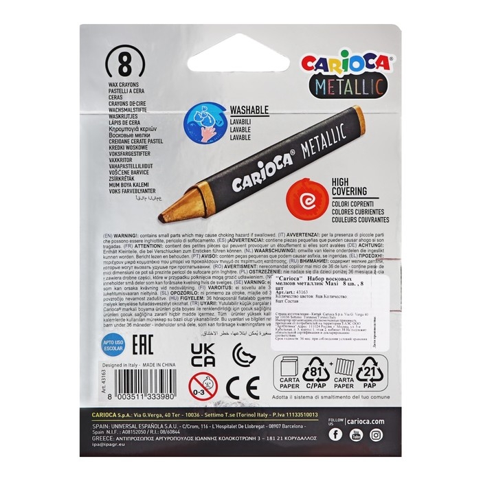 Мелки восковые 8 цветов, Carioca Maxi, яркие, с эффектом металлик, макси-треугольный корпус, для темных поверхностей