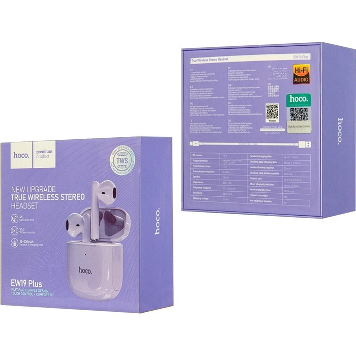 Наушники Hoco EW19, TWS, беспроводные, вкладыши, BT 5.3, 25/300 мАч, фиолетовые