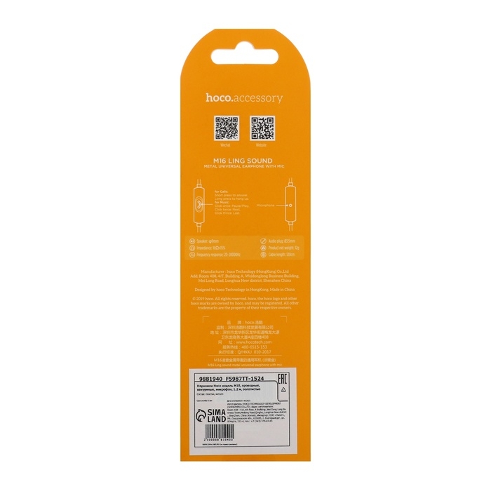 Наушники Hoco M16, проводные, вкладыши, микрофон, 1.2 м, золотистые