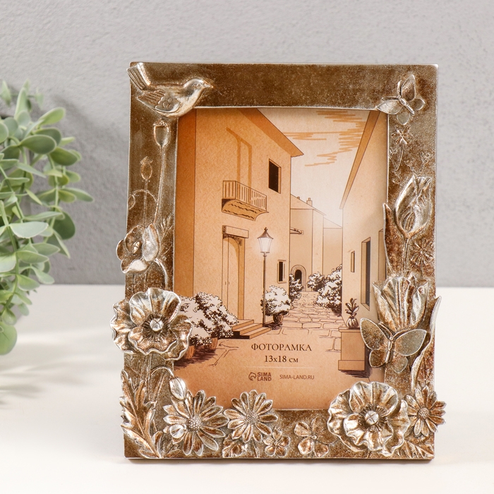 Фоторамка полистоун 13х18 см "Ромашки, тюльпаны и маки" серебро и бронза 18х2,5х22 см