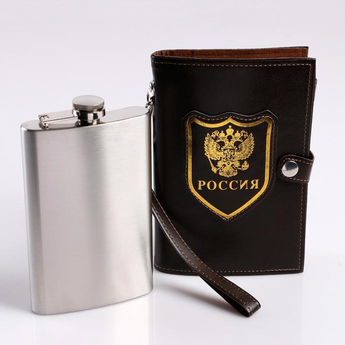 Фляжка для алкоголя и воды, 300 мл, "Герб", нержавеющая сталь, чехол, подарочная