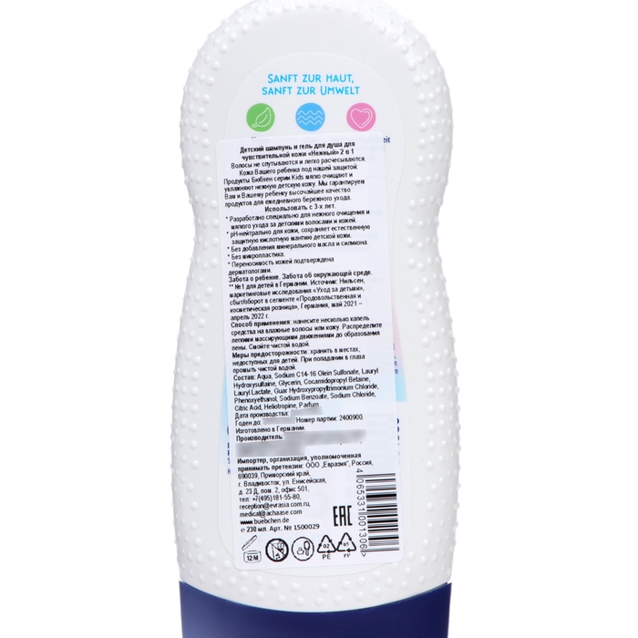 Качественный шампунь из Германии. Шампунь и гель для душа для детей с чувствительной кожей «Нежный» 2 в 1 очищает особенно бережно благодаря своей нежной пене. рН- нейтрален для кожи и сохраняет естественный защитный барьер нежной детской кожи. Для ежедневного ухода за кожей и волосами. Без спутанных волос, без слез. Для детей с 3-х лет и для всей семьи.