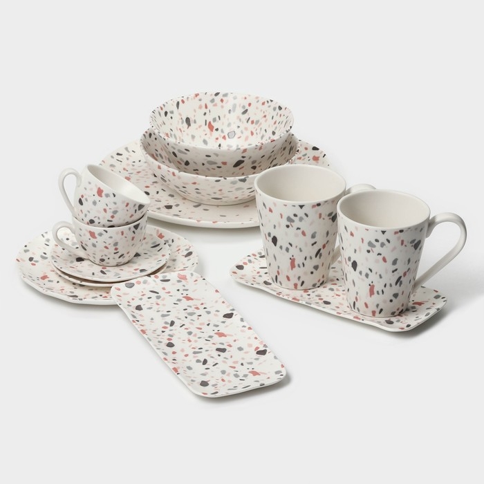Изделия устойчивы к механическим повреждениям, имеют цветное покрытие, которое долго сохраняет яркость. Вся посуда подходит для использования в посудомоечной машине. Выполнены из высококачественного фарфора в серии посуды Terazzo.