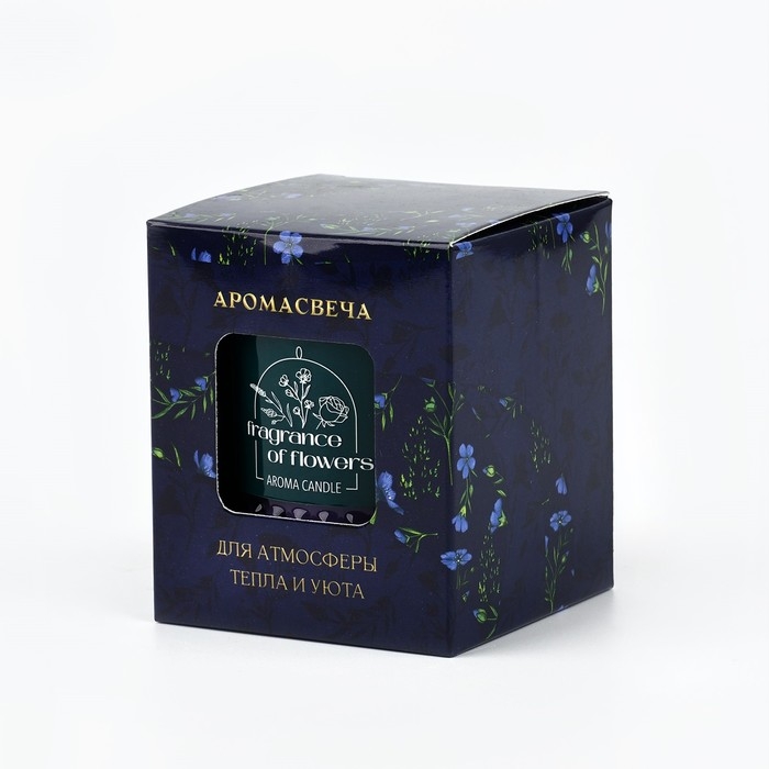 Свеча упакована в картонную коробку с изображением цветов на синем фоне.