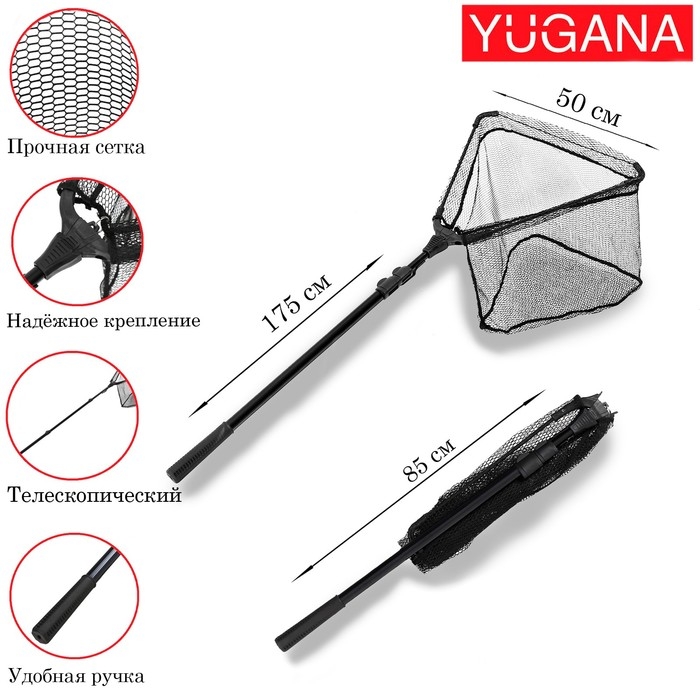 Складной телескопический подсачек с прочной рукояткой и сачком из прорезиненного полиэстера. Сетка из такого материала меньше травмирует рыбу и минимизирует запутывание в ней крючков. Голова подсачека обладает положительной плавучестью, что облегчает процесс подсачивания рыбы и позволяет не потерять подсачек в случае, если он выпадет из лодки.
