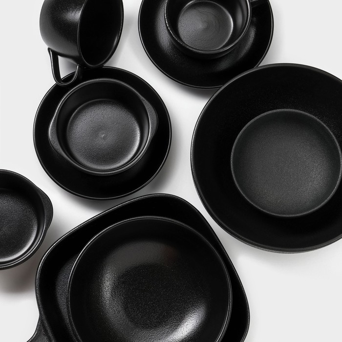 Посуда выполнена из высококачественного фарфора, матовая поверхность которого имитирует естественную фактуру камня благородного чёрного цвета. Каменная поверхность добавляет прочности изделиям, она не царапается, цвет со временем не тускнеет. Предметы из серии ощутимо тяжелее обычных фарфоровых аналогов.
