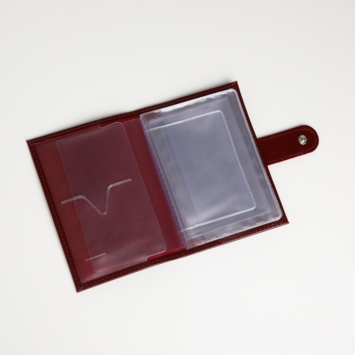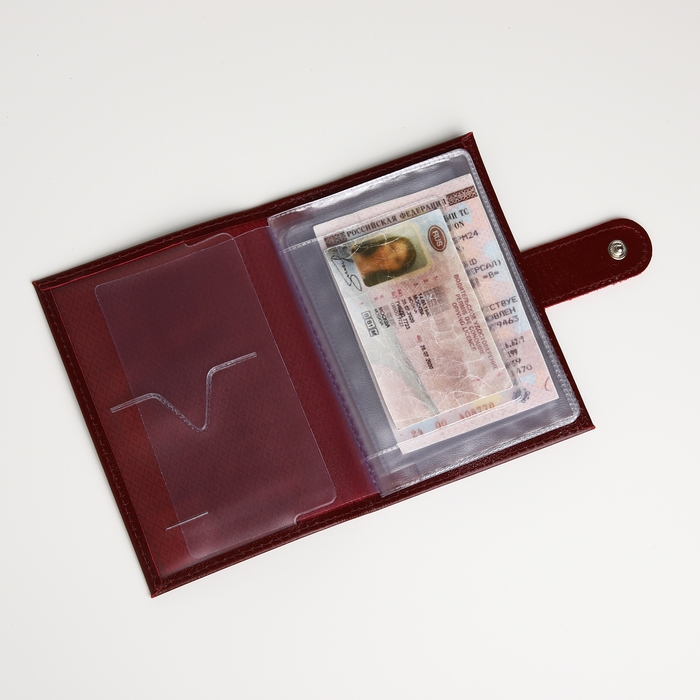 Благодаря глубокому бордовому цвету обложка станет отличным дополнением к любому образу, а качественная кнопка обеспечивает надежную фиксацию документов.