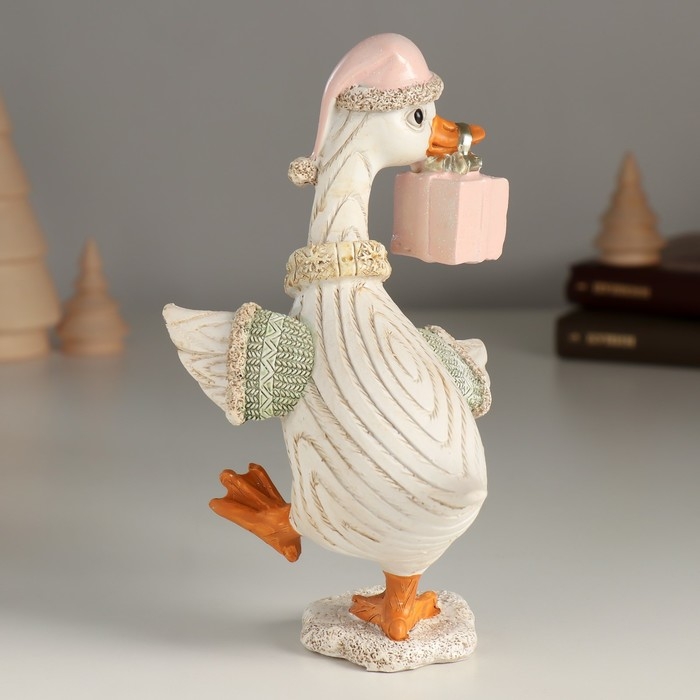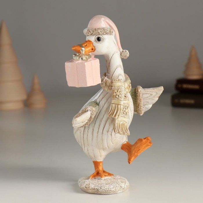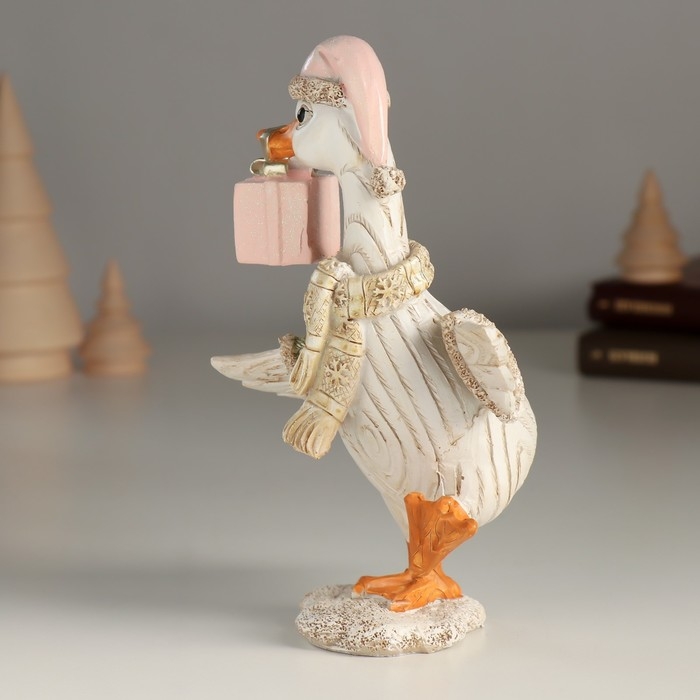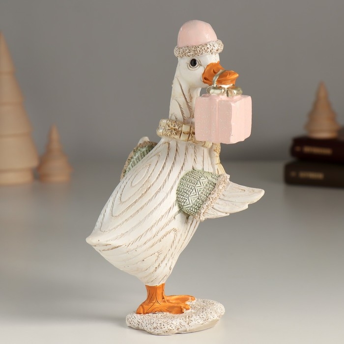 Сувенир полистоун "Гусь в шарфике и шапке с подарком" 10х9,5х16 см
