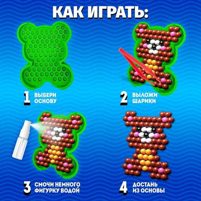 С шариками для аквамозаики от торговой марки «Эврики» ребёнок соберёт объёмные фигурки из цветных бусинок. Под воздействием жидкости детали плотно скрепляются друг с другом и превращаются в объёмные фигурки, с которыми можно играть.