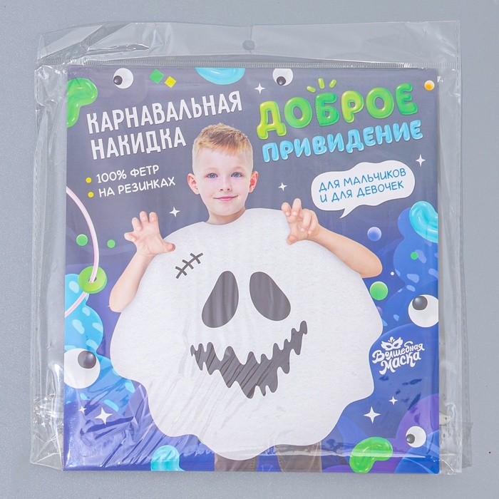 Карнавальная накидка «Доброе привидение» — это универсальный выбор для детских праздников и тематических вечеринок. Накидка подходит для различных мероприятий: школьные праздники, тематические вечеринки, карнавалы и Хэллоуин. Её можно легко надеть поверх обычной одежды, за счёт чего костюм удобен в использовании.
