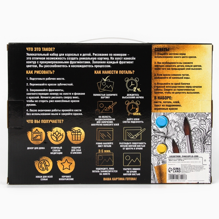 Картина по номерам - это холст, который разделён на множество мелких фрагментов, на каждом из которых указано число, соответствующее цвету, которым нужно закрасить данный участок. Простота и удобство в использовании делают этот набор идеальным выбором для всех, кто хочет попробовать себя в живописи.