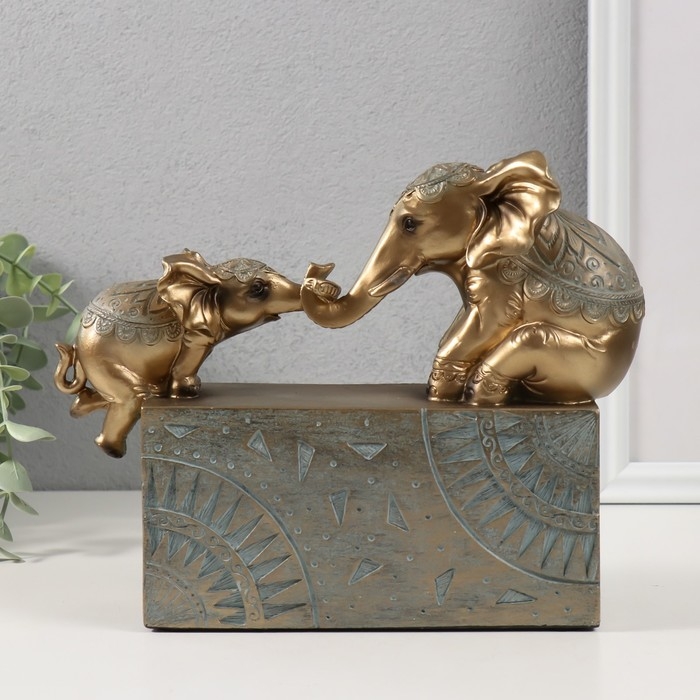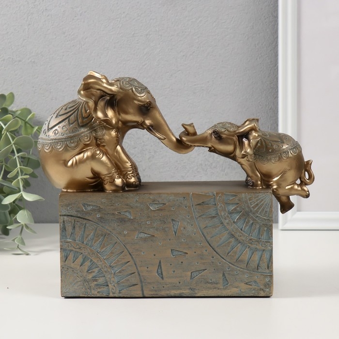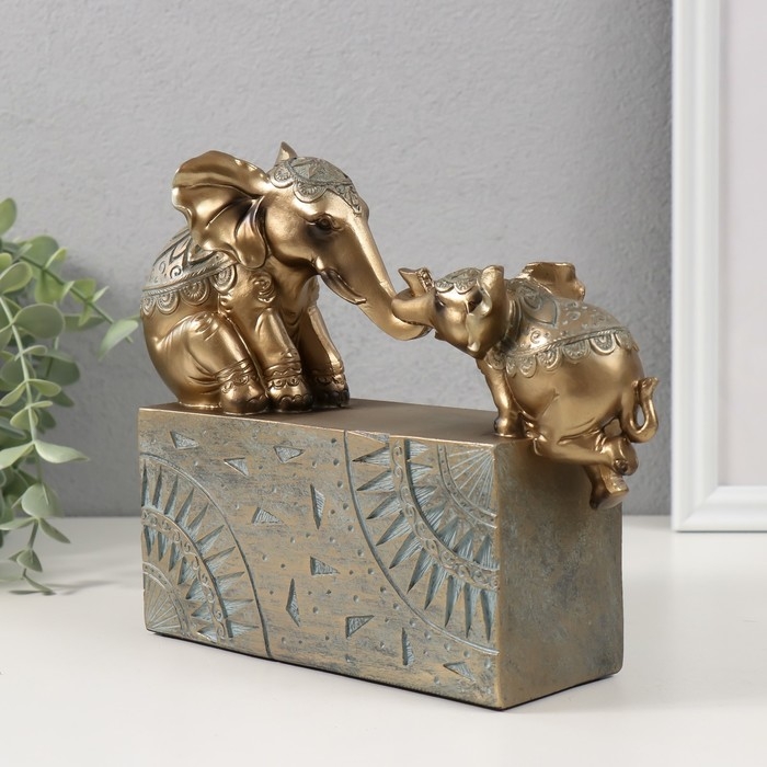 Сувенир "Слон с малышом на прямоугольнике с узорами" бронза с патиной 22,5х6,5х17,5 см